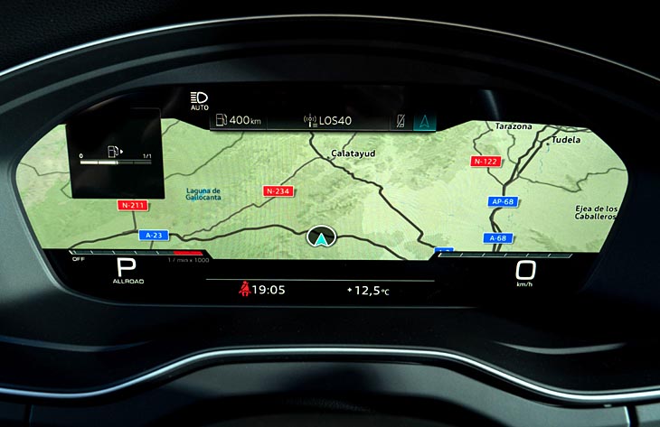El cuadro de instrumentación es digital de serie, una pantalla de 12,3” desdoblada en dos niveles (Virtual Cockpit, y Virtual Cockpit Plus), el primero con pocas posibilidades de configuración y limitado al acabado básico, y el segundo más avanzado, pudiendo seleccionar su información a gusto del conductor. También cuenta con “Head-up display” opcional, mientras que el navegador MMI Plus es de serie en todos los niveles menos el básico, e incluye el servicio Audi Connect, con funciones como cálculo de rutas en función del estado del tráfico, previsión meteorológica en itinerario y destino, etc.