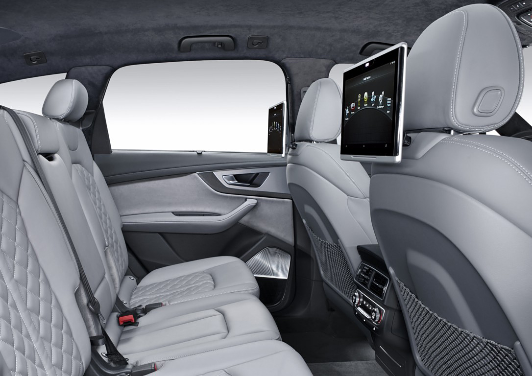 Dotado de cinco o siete plazas, la ganancia de espacio en el interior establece un nuevo punto de referencia en el segmento. Con el Audi SQ7 los clientes tienen la posibilidad de elegir entre dos tipos de asientos: sport y sport plus. Los asientos plegables de la segunda fila proporcionan un acceso más fácil a la tercera fila opcional, mientras que el portón trasero eléctrico forma parte de la dotación de serie. El SUV cuenta con elegantes soluciones de diseño en el interior, incluidos los instrumentos analógicos con fondo gris y agujas blancas, las pantallas especiales de bienvenida y las insignias S. El SUV también está disponible con un acabado deportivo, en el que los protagonistas son el cuero con costuras en contraste, las terminaciones en Alcantara y los asientos deportivos tapizados con cuero Valcona.