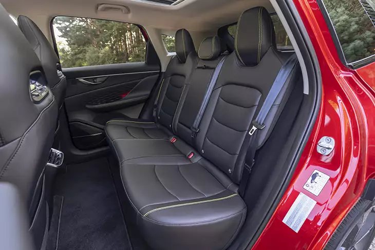 La zaga incorpora una banda central en el portón del maletero que repite el nombre de la sede del fabricante chino, además de parte de los pilotos traseros, dotados con iluminación LED. Mientras, la vista lateral muestra las manijas enrasadas en la carrocería, un gran arco cromado que recorre todo el marco superior de las ventanillas y los pasos de rueda reforzados que alojan llantas de aleación de 19″ con neumáticos 225/45R19. El modelo cuenta con dos finos rieles de techo a juego con el color negro a contraste con el color de la carrocería.