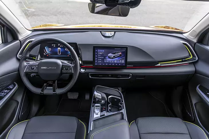 La ausencia de botones físicos en el salpicadero, hace que todo, incluso la climatización bi-zona (con purificador de aire), se controle desde la pantalla de infoentretenimiento (o mediante órdenes de voz), compatible con Apple CarPlay y CarbitLink (plataforma de conexión inalámbrica mediante USB).