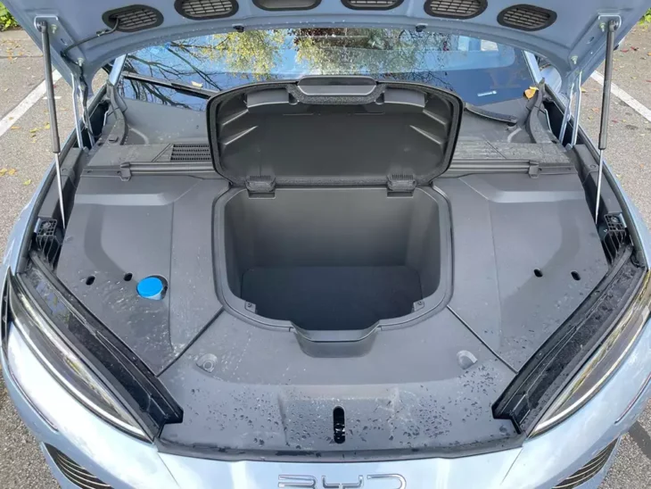 El maletero ofrece unos escasos (para su tamaño) 400 litros (con compartimento inferior), complementados por un pequeño compartimento delantero con tapa de 53 litros más, lo que mejora su versatilidad para uso diario al poder guardar ahí los cables de carga.