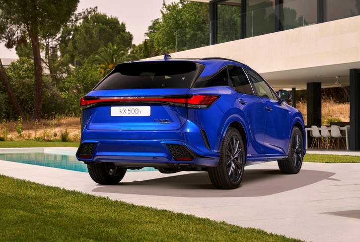 La versión más potente es la RX 500h, sólo ofrecida en el nivel F Sport, que ofrece un aspecto exterior distinto (cambia su parrilla, paragolpes y faldones laterales), junto a un acabado interior específico, con unos asientos delanteros más deportivos y detalles exclusivos en el habitáculo, además de la dirección DRS a las 4 ruedas y unos frenos reforzados, con unos discos de freno delanteros más grandes con pinzas fijas en aluminio de 6 pistones (con la peculiaridad de que los discos delanteros, de nada menos que 40 cm de diámetro, por 34 cm en sus hermanos, son sin embargo un cm más estrechos (28 mm frente a 38 mm). Y de remate, el RX 500h F Sport añade el control de tracción Direct4, que según Lexus «intensifica las sensaciones de la carretera en el volante, y ofrece una estabilidad de manejo mejorada”.
