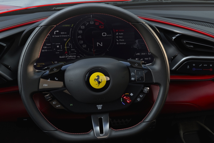 En el interior biplaza, tenemos dos asientos muy envolventes, un volante multifunción con gran cantidad de mandos incorporado al mismo, un cuadro digital (y con “head up display”) y dos “manettinos” en el volante, uno el famoso mando rotatorio de modos de conducción y otro de selección del funcionamiento del sistema híbrido (el e-Manettino), con hasta 4 niveles, uno para el funcionamiento totalmente eléctrico sin emisiones (e-Drive) siempre que se pueda por el nivel de carga de la batería, otro (Hybrid) para el funcionamiento mixto híbrido, que es el predeterminado desde el momento del arranque y en el que la gestión electrónica decide cuando actúa el motor de combustión, un tercero de máxima prestaciones (Performance) con el motor de combustión siempre funcionando para garantizar la carga de la batería y la máxima disponibilidad de potencia, y un cuarto último denominado Qualify de reserva eléctrica para uso urbano que prioriza el mantenimiento de la carga de la batería.