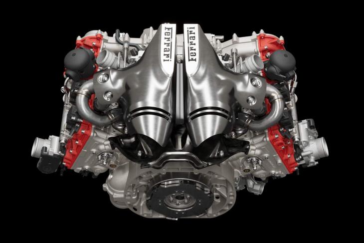 Pero lo más original de este motor de 6 cilindros totalmente nuevo, además de que la marca del “cavallino” recupera la fabricación para un vehículo de producción de una configuración 6 en V para su propulsor (desde el Dino de finales de los 60 no lo hacía), la novedad radica en su disposición casi “bóxer” (en V a 120º), nunca antes utilizada por Ferrari. Esta circunstancia aprovecha esta estructura en V muy abierta para alojar en su centro los dos turbocompresores IHI (uno por bancada), algo que inevitablemente incrementa la temperatura de los gases de escape que deben hacerlos girar, de ahí lo de “V caliente”, teniendo que emplear materiales más resistentes y mejorar además su refrigeración.