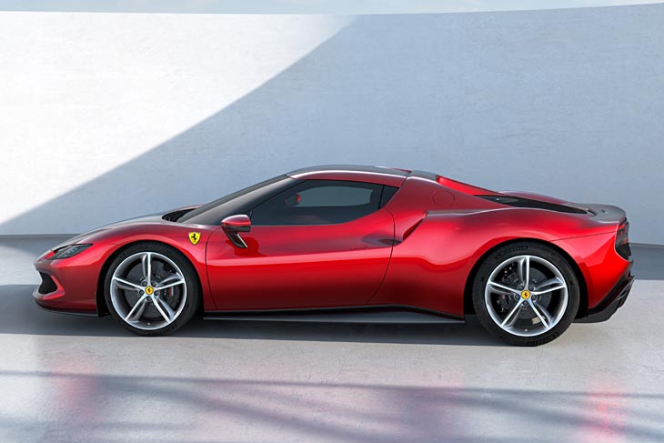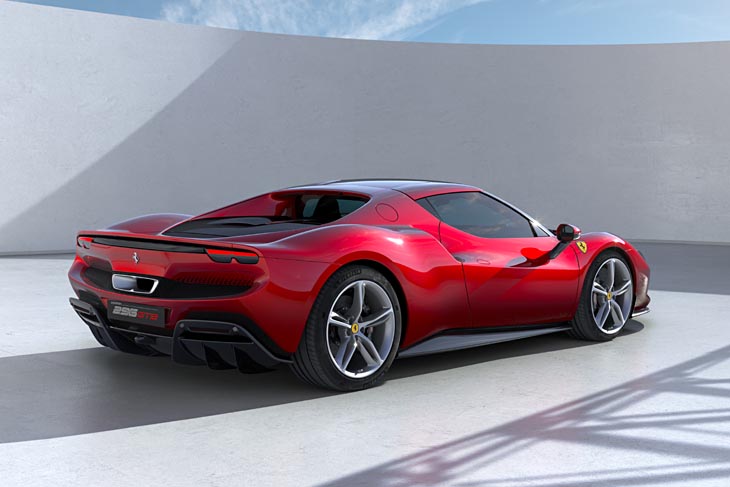 Se trata del segundo Ferrari híbrido enchufable tras el SF90 Stradale, un modelo completamente nuevo cuyas siglas GTB son las clásicas de Gran Turismo Berlinetta, y su denominación numérica indica, según Ferrari, las dos primeras cifras la cilindrada del motor (2.992 cc) y la tercera, el número de cilindros. Y es que su motor de combustión no es ni un V12 ni un V8, sino un compacto V6 biturbo de tres litros de cilindrada con cárter seco. Como típica “berlinetta” de la marca, se aloja en posición longitudinal central, permitiendo un tamaño bastante compacto, con la ayuda de una plataforma también nueva de 2,60 m de batalla, que son 5 cm menos que la del SF90 Stradale, último Ferrari con esta configuración, y viene a ser incluso corta para la tendencia actual. Así, su longitud total es bastante recortada (4,57 m de largo, por 1,96 m de ancho y 1,19 de alto), lo que le convierte en el Ferrari más corto de la producción actual (15 cm menos que el SF90), así como en el de menor batalla (según Ferrari “para mayor agilidad”, aunque en coches capaces de superar los 300 km/h lo más lógico sea buscar la máxima batalla dentro de lo posible) y compromete la supervivencia del Ferrari F8 Tributo.