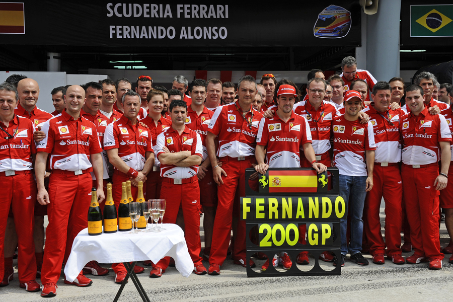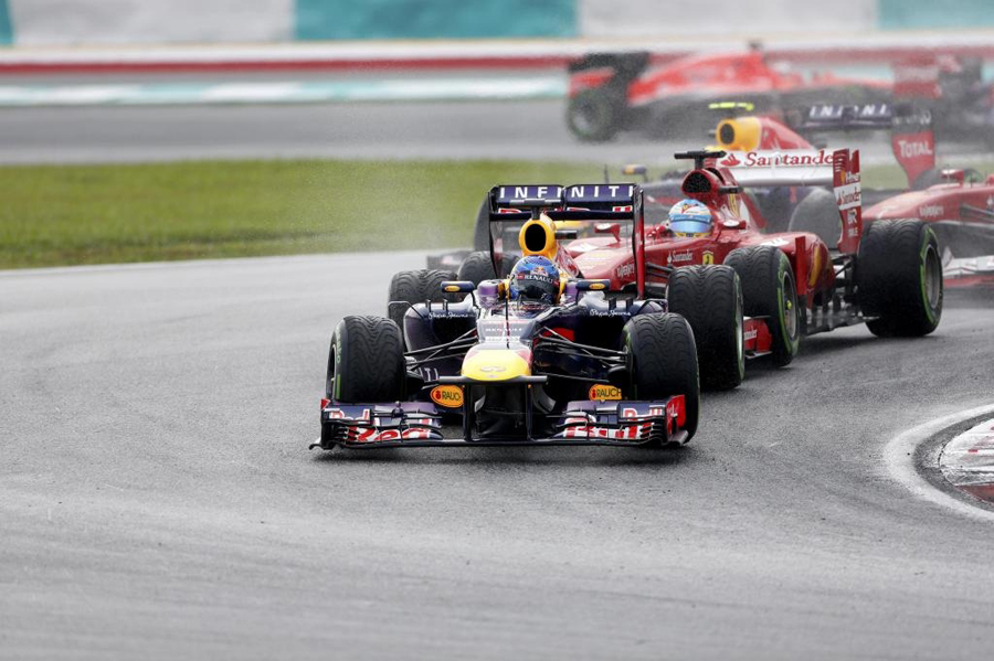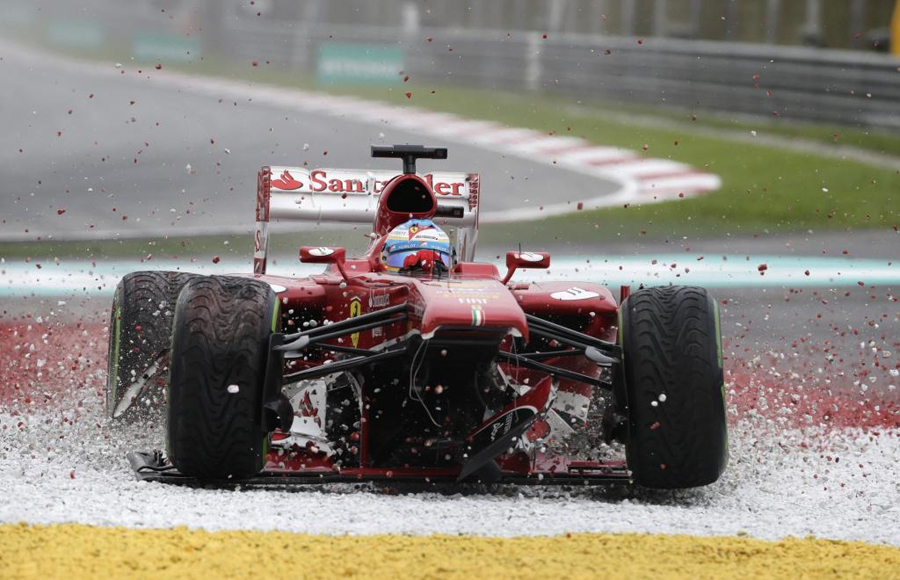En el box de Ferrari tomaron la decisión más arriesgada (que de haber salido bien les habría dado la victoria, probablemente) y decidieron seguir hasta completar tres vueltas más, suficiente para hacer la primera parada, quitar las gomas de lluvia (la pista se estaba secando a velocidad supersónica, típico en Malasia), montar las de seco y lanzarse a liderar la carrera. Pensaron que el alerón aguantaría, pues el toque fue levísimo contra el difusor del Red Bull de Sebastian Vettel, pero tras la pasada increíble a Webber, y lanzado Alonso en el rebufo de Vettel para ponerse primero, las turbulencias de ir detrás y la pérdida de carga aerodinámica en un sitio vital, hizo que el alerón se descolgase totalmente del morro del F138, lo que produjo un recto en la recta de meta que llevó a Alonso contra la escapatoria y dejando anclado su monoplaza, ya sin opciones de continuar. Ahí acabó su 200 aniversario y su segundo puesto momentáneo de la Clasificación de Pilotos que tras esta negra carrera para él, pasa a ocupar la sexta plaza lejos de la cabeza. Pero todavía queda mucha tela que cortar y ya por fin se puede decir que Ferrari está en todo lo alto luchando de tu a tu contra Red Bull. Tiempo habrá para recuperar el terreno perdido. ¿Alguien lo duda?, el Indomable no, desde luego.