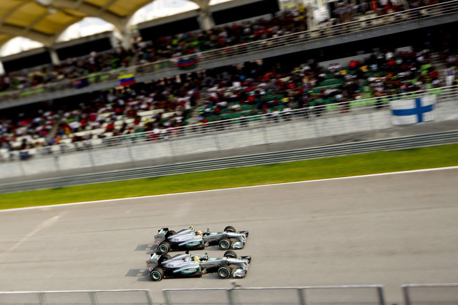 Además de todo esto, otra guerra tuvo lugar también sobre la pista de Sepang. La lucha entre los dos pilotos de Mercedes, Lewis Hamilton y Nico Rosberg. El joven piloto alemán iba detrás del inglés, que calzaba gomas más frescas, y se lanzó a por el ex de McLaren. Eran las últimas vueltas y el podio estaba en juego. Como era de esperar, Hamilton no se amilanó y no estaba dispuesto a dejarse pasar. Los galones del equipo estaban en juego. Desde el muro, Ros Brawn dio órdenes claras, meridianas, a sus pupilos: “Por favor mantén la distancia”, le espetó a Rosberg, quien respondió: “Creo que soy más rápido”. Pero Rosberg se doblegó sumiso, y demostrando que es un verdadero jugador de equipo, se plegó a los deseos del jefe Brawn. Lewis Hamilton, sabedor de la jugada y del intachable e inmaculado comportamiento de su compañero, se apresuró a agradecérselo de la mejor forma posible: “Siento que Nico tenía que estar aquí, es un gran compañero y ha hecho un gran trabajo. No he podido alcanzar el ritmo de los de delante, pero tengo que dar las gracias. No puedo decir que me sienta de la mejor forma posible, pero así son las carreras”. Nico Rosberg, por su parte no dejó pasar la ocasión para recordarle a su jefe de filas, Brawn, que él es un chico obediente. Al cruzar la meta, le dijo por radio: “Acuérdate de ésta”.