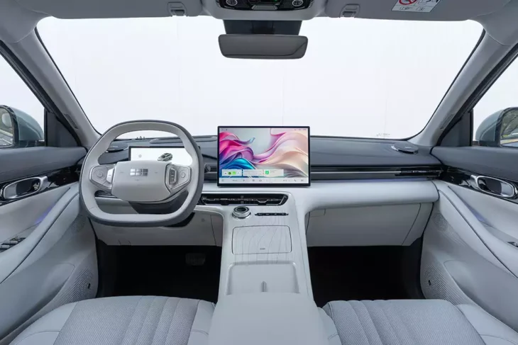 El sistema es compatible con Apple CarPlay y Android Auto, dispone de conectividad 4G, WiFi y actualizaciones OTA (over-the-air). También encontramos dos puertos USB-A y otros dos USB-C , una toma de 12V y una bandeja de carga inalámbrica, concentrado todo en la consola central flotante. Además, el asistente de voz inteligente permite controlar funciones del vehículo mediante comandos naturales activándolo con un ¡Hola Geely!
