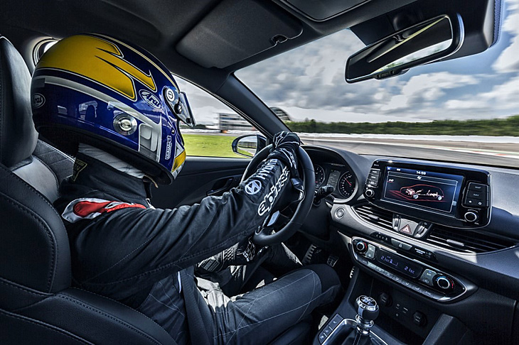 Interior deportivo.- Hay nuevos asientos de diseño más deportivo, lo mismo que el volante, pedales y palanca de cambio (siendo éste manual y de 6 relaciones). El cuadro es ahora más completo, con indicador del cambio de marcha, zona roja del cuentavueltas iluminada y distinto color según el modo de conducción elegido y la temperatura del aceite. La pantalla multifunción es de 8” (la mayor de la gama) y cuenta hasta con un programa de telemetría para medir los datos del coche en pista (tiempos por vuelta, aceleración lateral y longitudinal, etc). Dispone también de las ayudas electrónicas a la conducción y el equipo de conectividad de las versiones más equipadas de la gama i30 y la tapicería presenta costuras a contraste en azul, pudiendo ser textil o mixta piel/Alcántara.