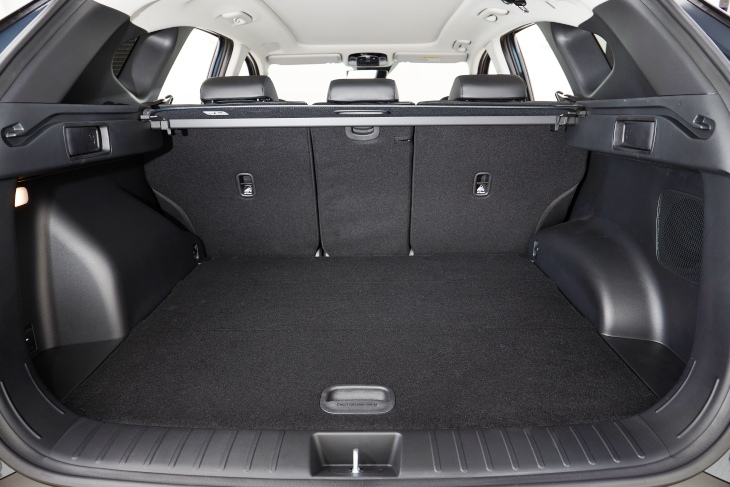 El maletero es amplio y cúbico, con un gran volumen (de 546 a 620 litros), variando según configuración motriz y versión. Los 620 litros máximos se corresponden con los respaldos de la segunda fila en posición vertical en el Tucson 4×2 sin hibridación (ni ligera ni “pesada”), y algo menos (598 litros) en los diesel, por el depósito de líquido de urea (“ad blue”).