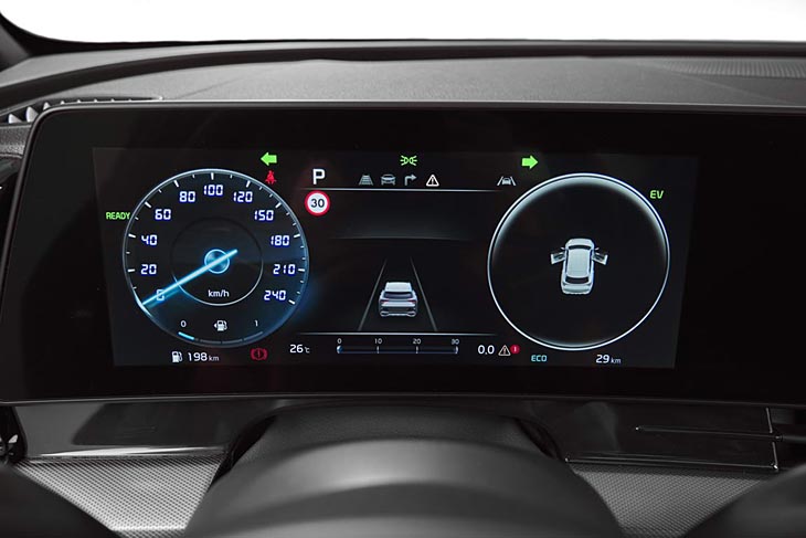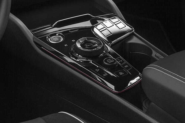 El diseño interior también es muy distinto con dos pantalla contiguas en el salpicadero (ambas de 12,3″, o sea 31 cm) una para el cuadro y la otra multimedia, colocadas juntas de forma que parece una sola pantalla muy ancha… En el fondo tanto el cuadro como la pantalla multimedia repiten el esquema de su primo, el nuevo Hyundai Tucson, y como en éste, Kia ha mantenido en el nuevo Sportage los mandos físicos de la climatización en la zona baja de la consola. La palanca de cambio da paso a un selector rotatorio sin conexión física directa a la transmisión, situado también en la zona baja de la consola.