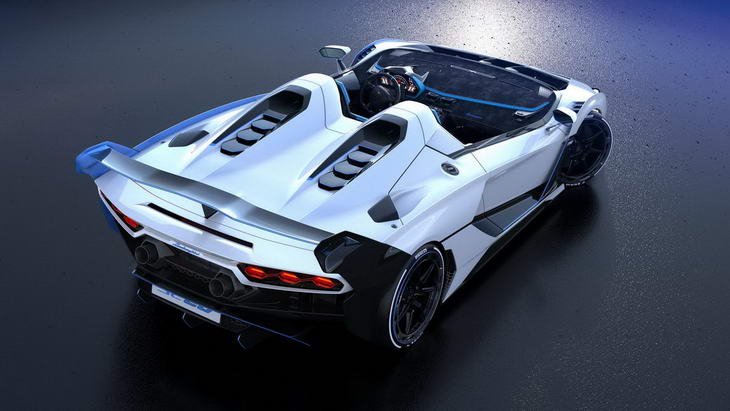 Esta impresionante “barchetta” tiene carrocería de fibra de carbono pulida y alisada a mano por técnicos de aerodinámica. Las entradas de aire delanteras están inspiradas en las del Lamborghini Huracán GT3 EVO, y los costados son parecidos a los del Lamborghini Essenza SCV12. En la parte trasera destacan unos sencillos pero bonitos pilotos LED hexagonales y monta un enorme alerón de carbono con posición de carga baja, carga media, y carga alta. Los escapes dobles se sitúan en posición elevada, dejando sitio a detrás. un difusor sobredimensionado.