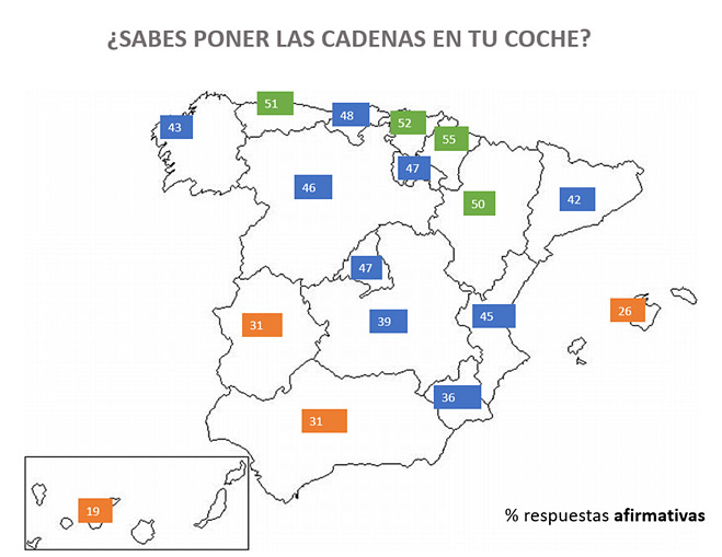 En la mitad de la tabla encontramos a santanderinos, logroñeses, madrileños, vallisoletanos, coruñeses, valencianos, barceloneses, toledanos y murcianos. Por el lado contrario, los habitantes de las capitales de las islas Canarias y Baleares, con menos probabilidades de acumular nieve en sus carreteras, son los que afirman tener mayor desconocimiento sobre cómo poner las cadenas en su coche (solo 2 de cada 10 afirman saber ponerlas), seguidos de los pacenses y los sevillanos, con un 31%.