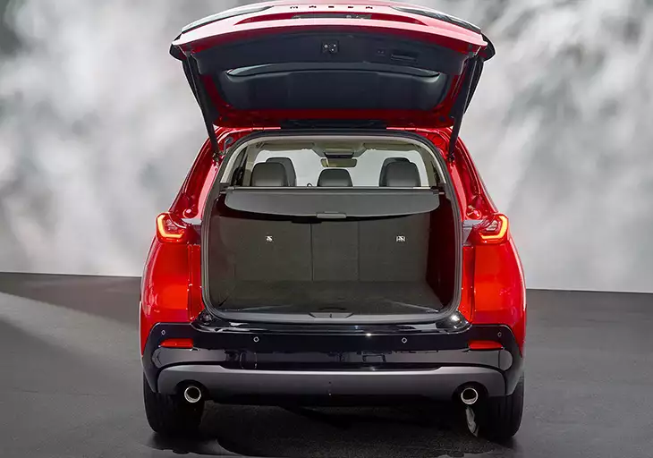 Los pasos de rueda alojan llantas de 17 ó 19 pulgadas en función del nivel de acabado (Prime Line, Centre Line, Exclusive Line y Homura) y vienen reforzados con embellecedores acabados en negro piano. Mientras, la zaga estiliza aún más los pilotos traseros alargando su recorrido hacia el interior del portón. En este sentido, hay una cierta similitud con el CX-60, sin embargo, este nuevo CX-5 reemplaza en su zona central el logo característico de la marca por su nombre.