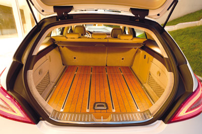 La segunda generación CLS (2011) ha puesto muy alto el listón en cuanto a diseño y calidad del habitáculo, y el Shooting Brake aplica este nivel de exigencia también al espacio de carga, revestido con moqueta de gran calidad: en combinación con el tapizado de cuero se utiliza este mismo material cosido a mano en los paneles laterales del compartimento de carga, con unas guías de aluminio opcionales para sujeción de la carga que le dan un toque aún más exclusivo. Pero la opción más especial (definida por la propia marca como “extravagante”) es la del piso en madera de cerezo, a contraste con la marquetería de roble negro y las guías de aluminio, dotando al espacio de carga de la elegancia de la cubierta de un yate en combinación con la fascinación de la tecnología y la precisión.