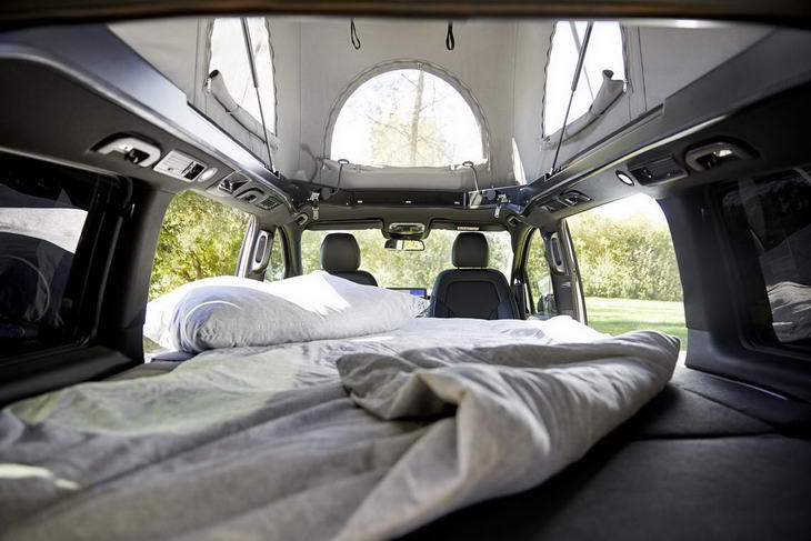 La Mercedes EQV preparada por Sortimo es totalmente modular, con tienda desplegable y colchón en el techo, y otra cama y una cocina en el interior. La cocina incluye fregadero, armarios con la cubertería y demás utensilios, cocina de gas de dos zonas y un pequeño frigorífico. La cama inferior está instalada sobre la cocina y se puede desplegar en pocos pasos.