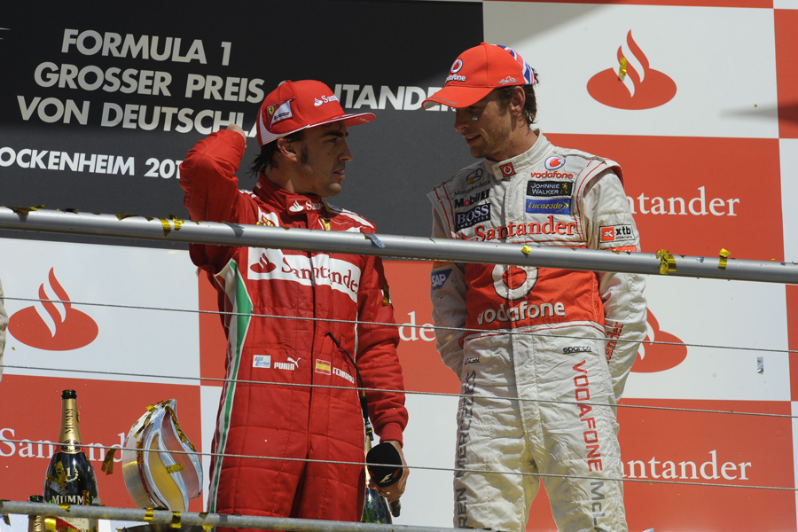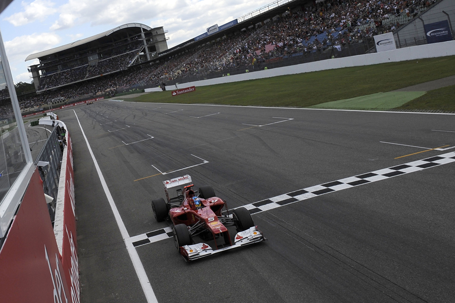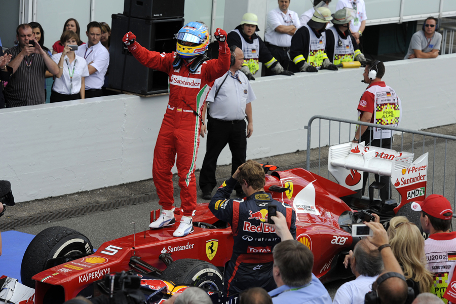 10: FERNANDO ALONSO: Terminator. Carrera perfecta, pero sufrida. Tercera victoria este año, 30 de su carrera, novena con Ferrari, siendo ya el líder en solitario tanto en puntos como en carreras ganadas. Aleja a sus rivales con un golpe de mano que ni siquiera podía haber soñado: Webber, Hamilton y Vettel, sus máximos rivales, pierden muchos puntos con él. Lo mejor, la demostración de fuerza y talento en todo el fin de semana. Pocas veces se ha visto a un piloto dominar aplastantemente tanto en mojado como en seco. Logró la pole en mojado (22 de su carrera), con conducción magistral. Segunda consecutiva de Ferrari, algo que no ocurría desde 2004. Y sorprendió a todos con una conducción primorosa en seco, con sol durante toda la carrera. Hasta ahora había ganado gracias a factores externos: lluvia, safety car, …, pero lo de Alemania ha sido la confirmación de que el Ferrari F2012 ya está al nivel de los de arriba. Alonso está a una carrera de igualar el récord absoluto de 24 carreras seguidas puntuando, en poder de Michael Schumacher.