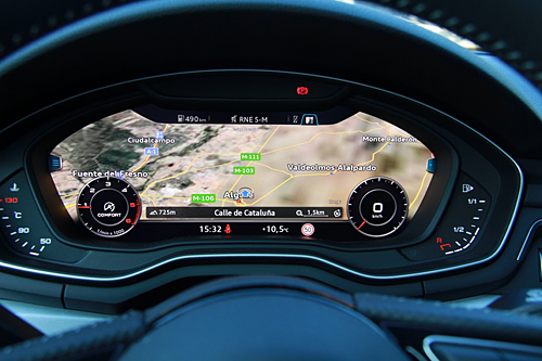 El cuadro varía según los acabados; el básico es analógico, pero desde el Advanced tenemos el original Audi Virtual Cockpit, una pantalla TFT configurable de 12,3”con multitud de informaciones. En caso de llevar cuadro analógico, entre los dos relojes principales (velocímetro y cuentarrevoluciones) hay un “mini display” (y no tan mini) para los datos del ordenador de viaje y los más esquemáticos del sistema de navegación. La pantalla multifunción de la consola es de 7” de serie, que sube a 8,3” con el MMI más sofisticado (el MMI Navigation Plus) de los niveles superiores, manejado mediante una rueda giratoria que presenta un panel táctil en su parte superior sobre el que se pueden marcar números y letras o ampliar o reducir el mapa del navegador, separando o alejando los dedos como en un teléfono móvil. De uso intuitivo y fácil, lo mejor de este equipo es que no es sólo táctil sino que posee pulsadores mecánicos precisos y visibles.