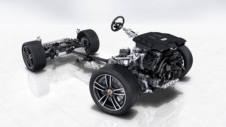 Su acción es la clásica en este tipo de direcciones: las ruedas traseras giran ligeramente en dirección opuesta a las delanteras hasta 80 km/h, y hacia el mismo lado a partir de dicha velocidad, con un ángulo de giro máximo de 3º en el eje posterior. También puede montar las barras estabilizadoras activas PDCC (Porsche Dynamic Chasis Control) para reducir el balanceo, ahora por control eléctromecánico (a 48 voltios, como en el Audi Q7) en vez de electrohidráulico. El PDDC permite una rigidez variable antibalanceo, máxima en autopista a alta velocidad, y mínima en uso “off road”.
