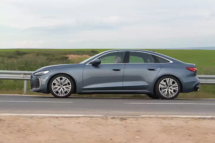 Este A5 es un coche que puede ir muy deprisa sin dar la sensación de ello; bien aislado, su ruido de rodadura (pese a un generoso tren rodante de neumáticos de 245/40 R19), apenas se nota, y como su motor térmico no necesita girar a alto régimen para empujar a fondo, tampoco se deja oír demasiado. Su aerodinámica es buena (Cx de 0,28) pero no excepcional (el anterior A4 llegó a tener un Cx de 0,25). Pero aún así, a velocidades altas se muestra fino y silencioso, y en autopista presenta (gracias a su peso) una importante inercia que hace que apenas pierda velocidad al desacelerar una vez lanzado, bajando su crucero muy lentamente, y que se embale con facilidad cuesta abajo en marchas largas (fruto también de unas fricciones internas reducidas al mínimo).