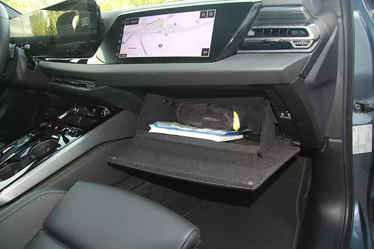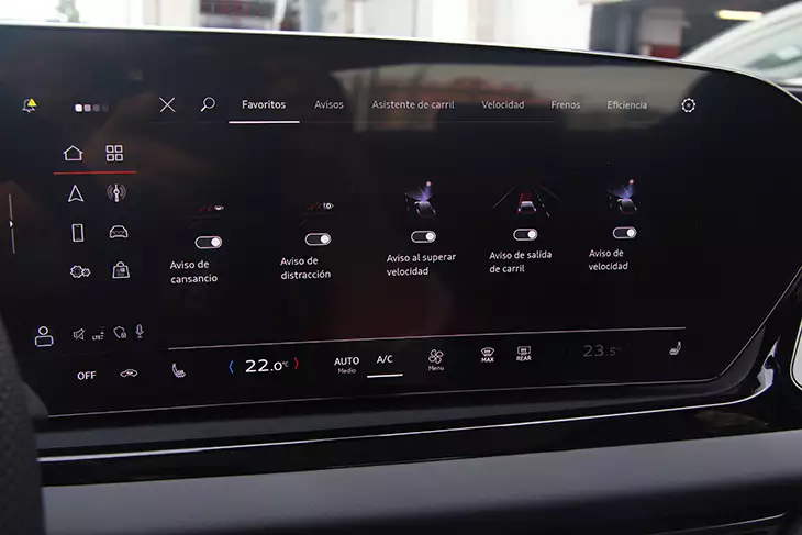 Una vez al volante (multifuncional y con su curioso diseño cuadrangular, con el aro achatado por abajo y por arriba), tenemos una visibilidad general bastante buena, y un salpicadero un poco al estilo del Q6 e-tron, siguiendo la tendencia de los últimos Audi. En el cuadro (digital, por supuesto) tenemos el clásico Virtual Cockpit de la marca que reúne dos pantallas contiguas bajo una misma visera; la del cuadro es de 11,9” (30,2 cm) y la central multimedia todavía mayor (14,5”, casi 37 cm), y aún puede haber una tercera opcional (esta vez algo menor, 10,9”, poco más de 27,5 cm) en el lado derecho para el acompañante delantero, para acceder individualmente a funciones multimedia y actuar sobre algunos servicios del coche.