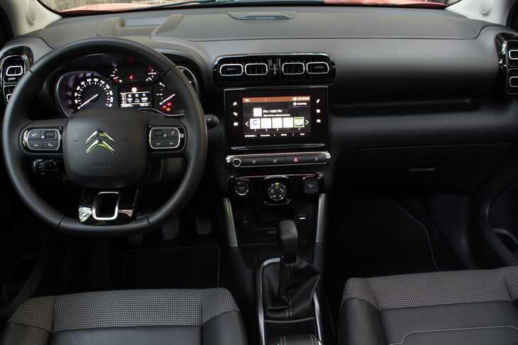 En cuanto al puesto de conducción, el volante forrado en piel tiene ajuste en profundidad y altura, equipa un cuadro de instrumentación analógico, el cambio va situado algo más elevado que en el Citroën C3 y los asientos son muy similares, con diferentes tipos de tapicerías, entre ellas una mixta piel-tela en el nivel probado Shine. El freno de mano presenta una extraña forma (aeronáutica, dicen) con el botón de agarre oculto en medio, y la pantalla multimedia central está situada un poco más abajo de lo deseable, pero por lo demás cumple bien su cometido y es bastante intuitiva, aunque podría llevar algunos botones directos para las funciones más frecuentes.