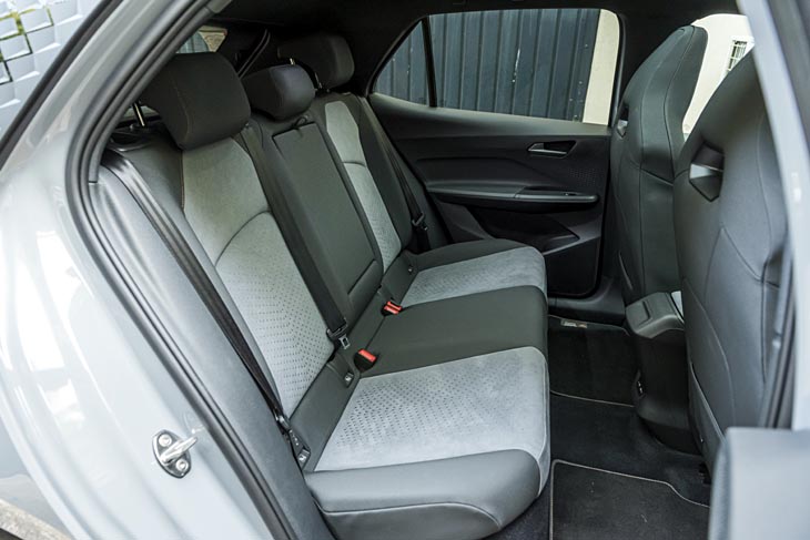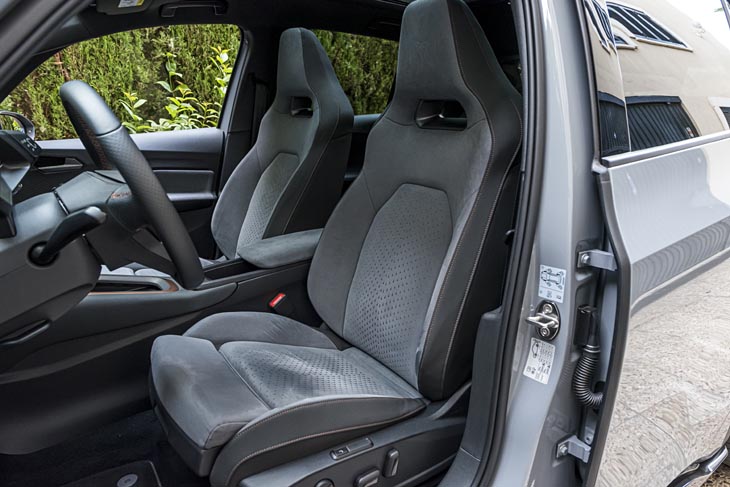 La posición al volante es formidable, especialmente para quien valore poderse sentarse cerca del suelo. Los asientos delanteros, con regulaciones eléctricas y calefacción ambos, sujetan lateralmente y tienen prolongadores de banqueta. El material reciclado que los tapiza, al margen de vistoso con sus perforaciones con láser, tiene un muy buen tacto. Comparativamente, raya a mayor nivel que el de los abundantes plásticos duros, algunos decorados con los mismos motivos que los asientos, que abundan por salpicadero o puertas.