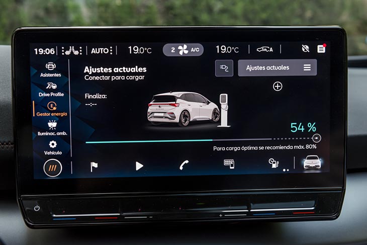 Aunque hemos recurrido a cargadores de 50 kW, los más comunes en la red comercial española, el Cupra Born puede recibir potencias mayores y, así, también conseguir recargas más rápidas. Por ejemplo, con esa corriente continua se puede llegar a contar con 170 kW y, de ese modo, alcanzar el 80 por ciento de la capacidad de su batería en 35 minutos.