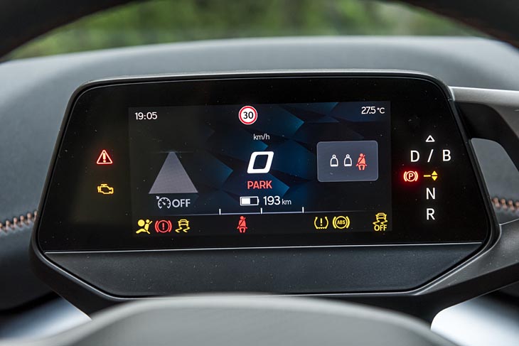 El minimalista puesto de conducción tiene elementos y funciones curiosas. Por ejemplo, una pequeña pantalla para instrumentación -en realidad nada diferente a la de cualquier otro eléctrico con esta plataforma- con poca información: no da el porcentaje de energía restante en la batería, para lo que hay que pasar por la pantalla central. Sin embargo, nos ha gustado que no sea necesario pulsar el botón de arranque para que el motor se conecte. En realidad, con llevar la llave en el bolsillo y sentarnos en la butaca (el auténtico “contacto” está aquí), el Born ya está listo para iniciar el movimiento tras seleccionar el sentido de la marcha mientras pisamos el freno.