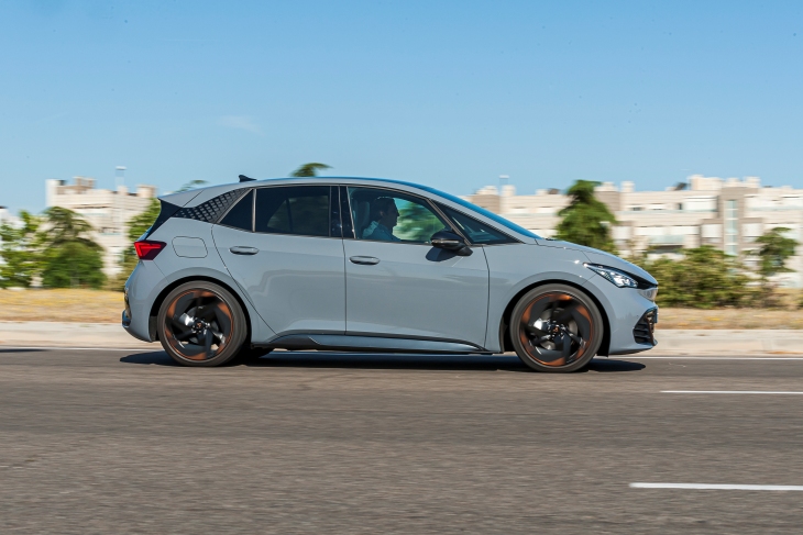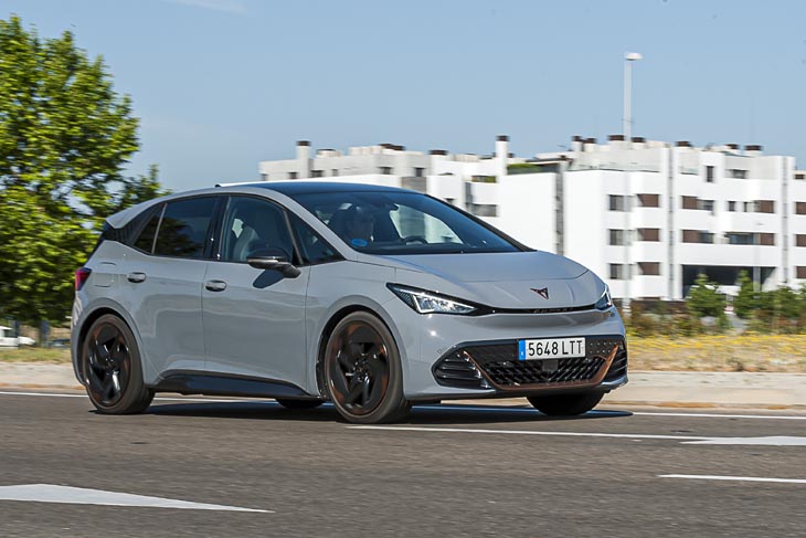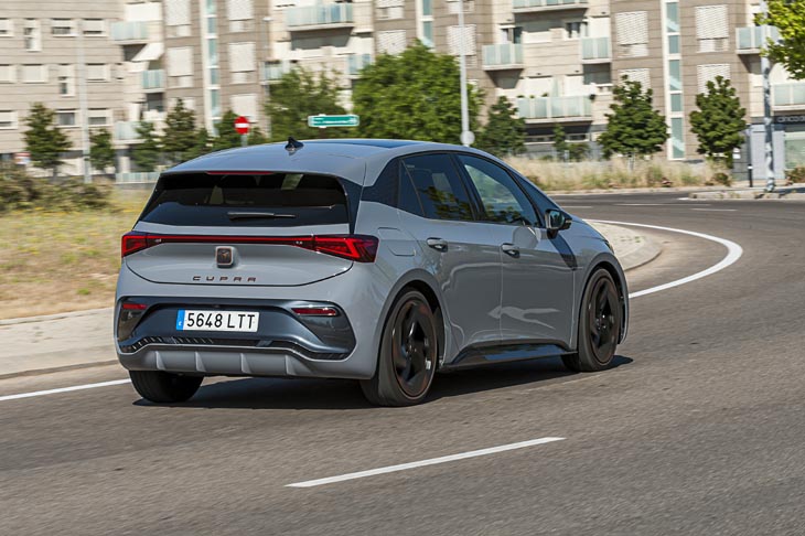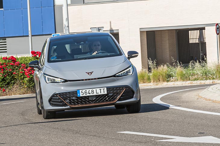 Por lo demás, quien espere un indómito eje trasero con carácter para marcar la salida de las curvas, y por mucho que se disponga de hasta 310 Nm de par máximo, no lo va a encontrar en el Born, un coche que se conduce esencialmente con el eje delantero. Nuestra unidad no contaba con amortiguación regulable, pero sí con el trabajo específico que Cupra ha volcado sobre la suspensión de esta plataforma MEB. Y es que aún con unos muelles sensiblemente más cortos que los del ID.3 -15 mm más en el eje delantero y 10 en el trasero-, este Born se siente, a la vez que bien sujeto, con un relativo buen confort de bacheo. Incluso eso ocurre con exageradas llantas de 20” y perfil bajo de neumático.
