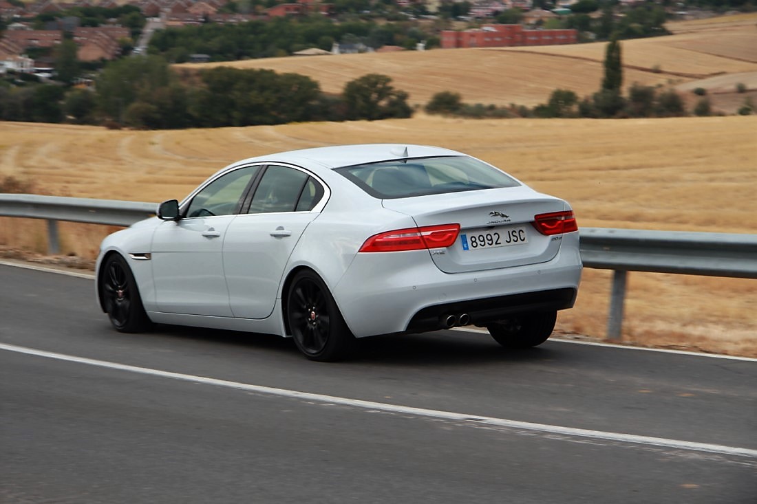 Por una parte, hay que decir que el Jaguar cuenta con una dirección asistida eléctrica muy bien puesta a punto. El tacto y las sensaciones que transmite están muy logrados, amén de que la precisión me parece encomiable. Las suspensiones, por otra parte, son de lo más sofisticadas, sobre todo en el eje trasero. Delante encontramos unos triángulos superpuestos y, detrás, un eje multibrazo. El comportamiento dinámico es, en cualquier caso, realmente muy bueno. Me atrevería a decir que está situado entre la eficacia de un Serie 3 y la calidad de rodadura del Clase C. Lo bastante ágil en zona virada y más que aplomado en curva rápida.