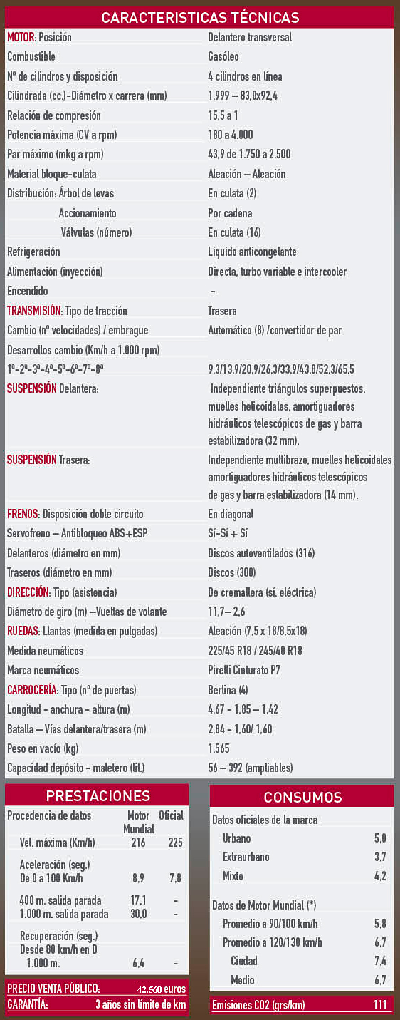 Motor y cambio.- El conjunto motor y cambio también me han parecido muy buenos. No digo perfecto porque el motor diésel es algo hosco, ya que suena y vibra más de lo que nos gustaría (algunos de sus rivales, como el Mercedes C220 BlueTec 7G-Tronic o el Infiniti Q50 2.2d Aut. —que llevan el mismo conjunto motriz— también suenan y vibran). Y tampoco el sistema stop&start que montaba nuestra unidad de pruebas era todo lo refinado que cabe esperar, ya que al arrancar produce una molesta sacudida de la carrocería. Al menos, una vez que salimos a carretera y mantenemos un crucero de unos 120 km/h, el ruido y las vibraciones pasan a un segundo plano.