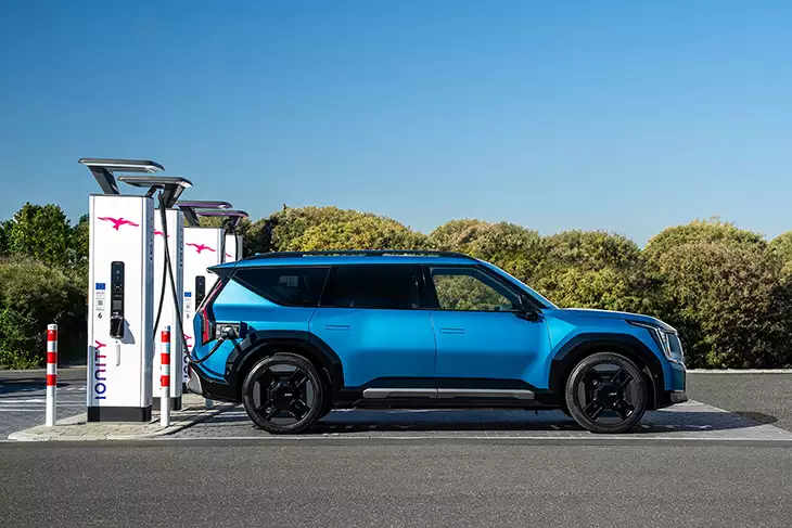 Asimismo, la E-GMP permite usar dos motores, uno por eje -en otros mercados, también los hay con sólo uno-, ambos de tipo síncrono, con una entrega en cada uno de ellos de 192 CV (141,3 kW) y 350 Nm; si bien lo más sobresaliente y su gran ventaja, no es tanto esto -los 384 CV (282,6 kW) del EV9 son una cifra relativamente modesta-, sino la utilización de una arquitectura eléctrica de 800 voltios. Esto permite usar emplear cargas ultrarrápidas, de hasta 240 kW con corriente continua en este Kia, y una solución para recibir mucha energía en poco tiempo.