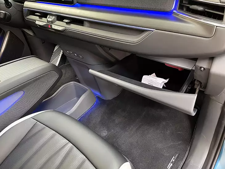 Al no tener una continuación del salpicadero que una con la consola central en la parte superior -sí hay una bandeja que lo hace a la altura de los pies-, si usamos estos puertos para carga, por ejemplo, para cargar el móvil los cables quedan colgando. Y es que esto puede ser necesario toda vez que un coche tan grande y lujoso como este EV9 únicamente cuenta con una única base de carga inalámbrica.