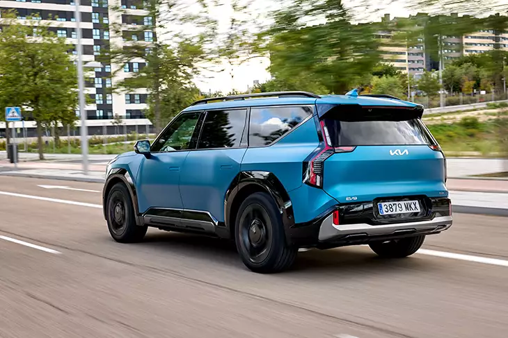 Y es que, en el EV9 todo es grande. El frontal, los grupos ópticos -también los verticales pilotos-, las entradas de aire, los marcadísimos y casi hexagonales pasos de rueda, tan evidentes como los estribos laterales que remarcan su enorme distancia entre ejes, de nada menos que 3,10 m… Son rasgos que no pasan desapercibidos en una carrocería que, aún con una presencia visual evidente, no percibimos como provocadora o agresiva.