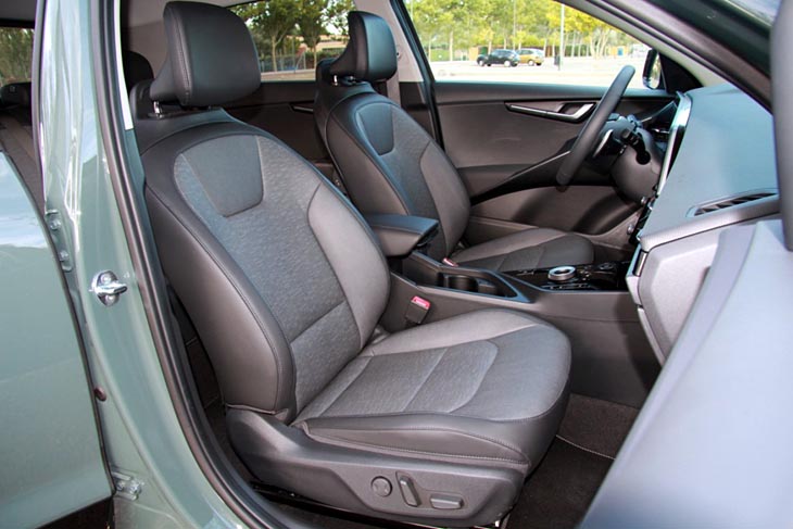 En el interior del Kia Niro HEV sorprende la gran amplitud de todas sus plazas; si ya el Niro anterior destacaba por su espacio interno, este lo mejora todavía más, sacando el máximo provecho a esos 2 cm extra de batalla. Las plazas traseras aumentan un poco más el ya de por sí amplio espacio para piernas (casi 80 cm), pudiendo acomodarse con holgura adultos de hasta 1,90 m de estatura. Incluso la plaza posterior central, algo más dura de banqueta, ofrece un buen asiento gracias a un túnel central bastante bajo.
