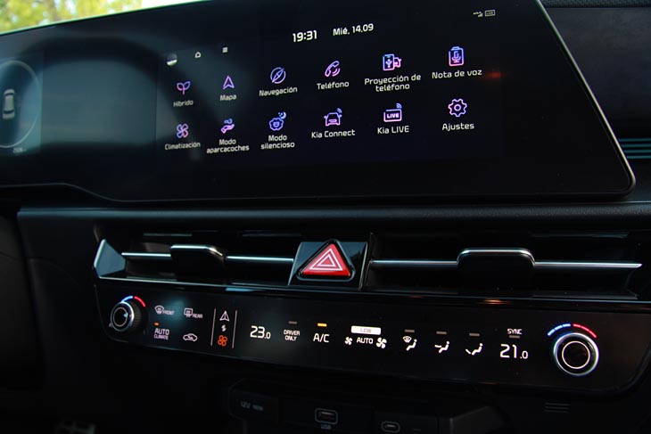 El salpicadero no tiene nada que ver con el del anterior Niro, ahora presenta un diseño asimétrico que según Kia “combina formas horizontales y diagonales”. En este nivel Emotion hay dos pantallas, una de 10,25” para el cuadro de instrumentación y otra multimedia también de 10,25” en el salpicadero (en el nivel de acceso es de solo 8”). Opcionalmente también puede tener la proyección de datos en el parabrisas (el Head Up Display) en una amplia superficie de 10” donde se muestran los datos de navegación, asistentes a la conducción, velocidad, etc…