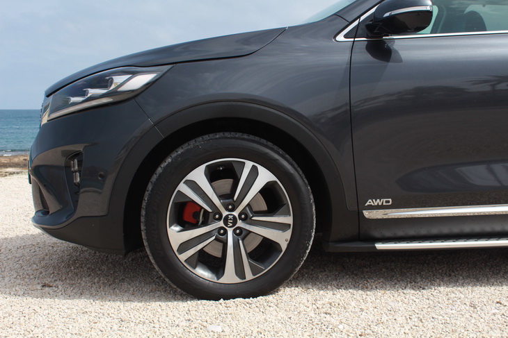 La suspensión de este Kia Sorento no varía (independiente a las 4 ruedas, por eje anterior MacPherson y posterior multibrazo) y las ruedas suben en este nivel GT Line a las 19” de diámetro, con neumáticos de 235/55 R19. Aquí es oportuno hacer una recomendación de que se vigile su desgaste, porque el mayor peso de los SUV y el mayor par de sus motores (principalmente diésel) los desgastan antes. Nuestra unidad de pruebas, con solo 23.000 km, llevaba ya bastante desgastados los delanteros.