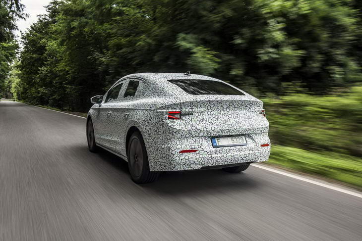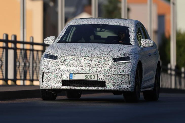 Anticipado por el Concept Skoda Vision iV, de momento la marca de origen checo muestra las primeras fotografías del nuevo modelo bajo un denso camuflaje, que sin embargo permite ver con claridad la caída de su pilar trasero. La nueva carrocería coupé añade un toque más deportivo y mejora la aerodinámica del modelo, con un coeficiente de resistencia aerodinámica de 0,247. La luna trasera se encuentra en una posición inclinada y no vertical como la carrocería estándar, por lo que la línea se alarga visualmente y ofrece un aspecto que refleja más dinamismo y deportividad.